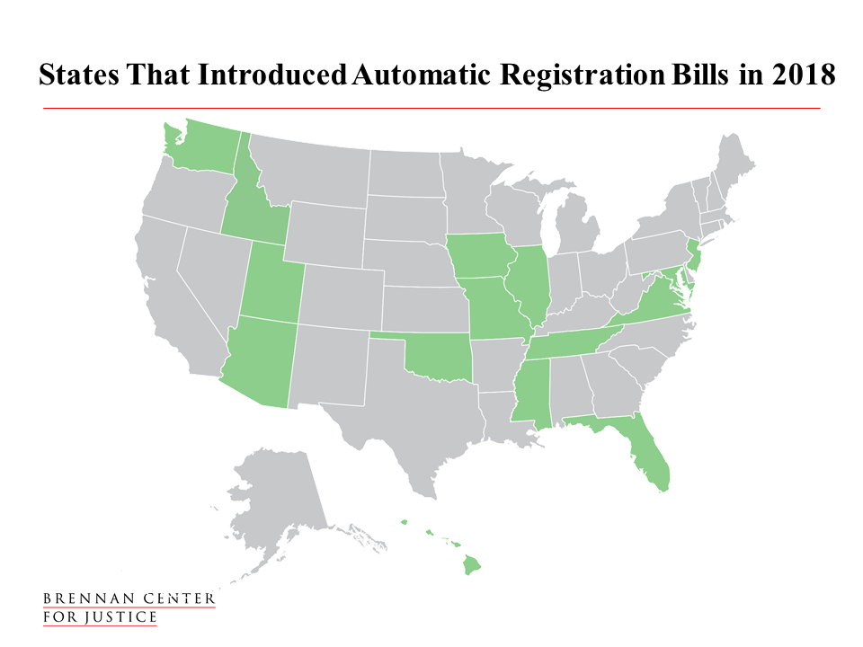 States that have introduced automatic voter registration in 2018 currently are Washington, Idaho, Utah, Arizona, Oklahoma, Iowa, Missouri, Illinois, Mississippi, Tennessee, Florida, Virginia, Maryland and New Jersey.